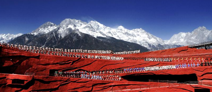 著名导演张艺谋执导--雪山印象丽江 以雪山为背景,汲天地之灵气,取自然之大成,以民俗文化为载体,用大手笔的写意,在海拔 3100 米的世界上最高 的演出场地。