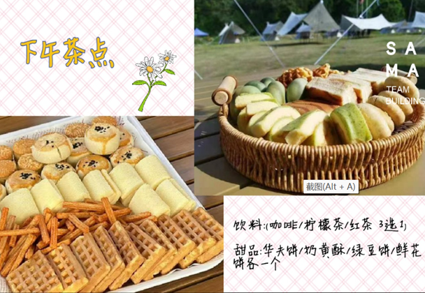 下午茶提供有:华夫饼/奶黄酥/绿豆饼/鲜花饼各一个。
